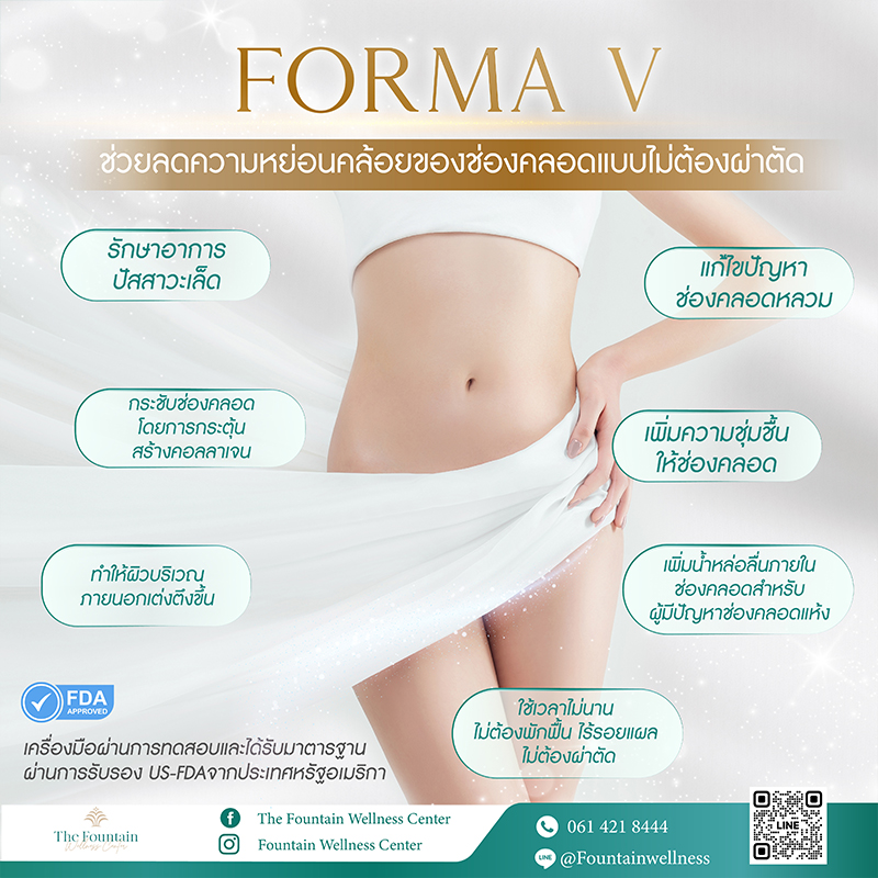 คุณสมบัติของเครื่อง FORMA-V คือ การถูกพัฒนาขึ้นเพื่อเข้าไปกระชับช่องคลอดพร้อม ๆ กับให้ความรู้สึกอ่อนโยน ทำให้ไม่เจ็บแสบผิวเป็นการใช้พลังงานคลื่นความถี่ RF หรือ Radio Frequency ในการเพิ่มความกระชับโดยการกระตุ้นการสร้างคอลลาเจนในชั้นผิวบริเวณภายในจุดซ่อนเร้นโดยไม่ทำให้เจ็บ เพียงแค่จะรู้สึกอุ่น ๆ โดยหัวเลเซอร์ยังมีขนาดเพียง 2 x 1.5 เซนติเมตร เท่านั้น เพียงแค่รู้สึกอุ่น ๆ หลังจากทำจะสามารถรู้สึกถึงความกระชับได้ทันที และลดอาการ ช่องคลอดหลวม ตั้งแต่ครั้งแรกที่ทำ โดยที่ไม่ทำให้เกิดรอยแผล ไม่ต้องพักฟื้น ไม่ต้องงดกิจกรรมทางเพศอีกด้วย
