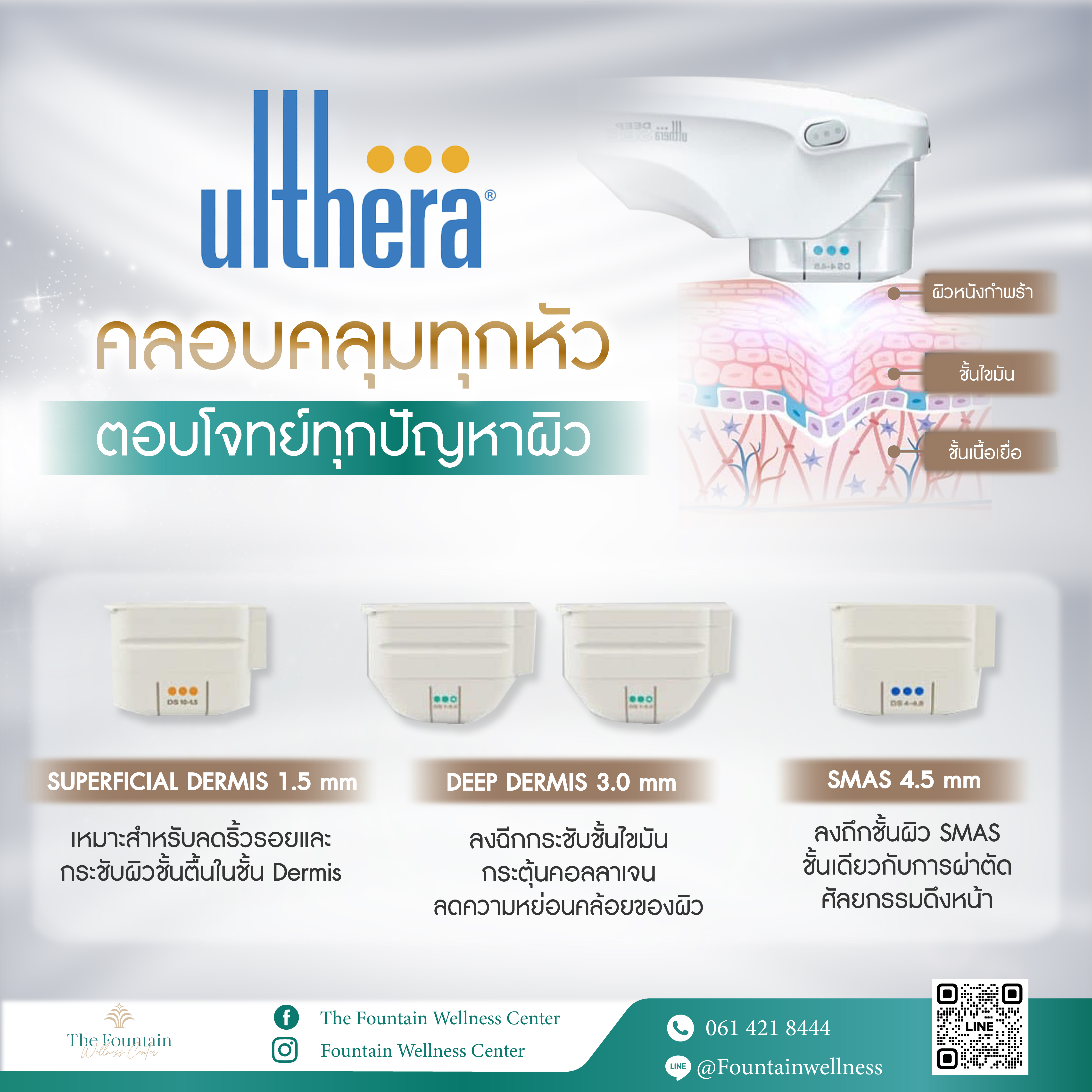 • หัวยิงลึก 1.5 mm ลดริ้วรอยผิวชั้นบน ในชั้นหนังกำพร้าและชั้นหนังแท้