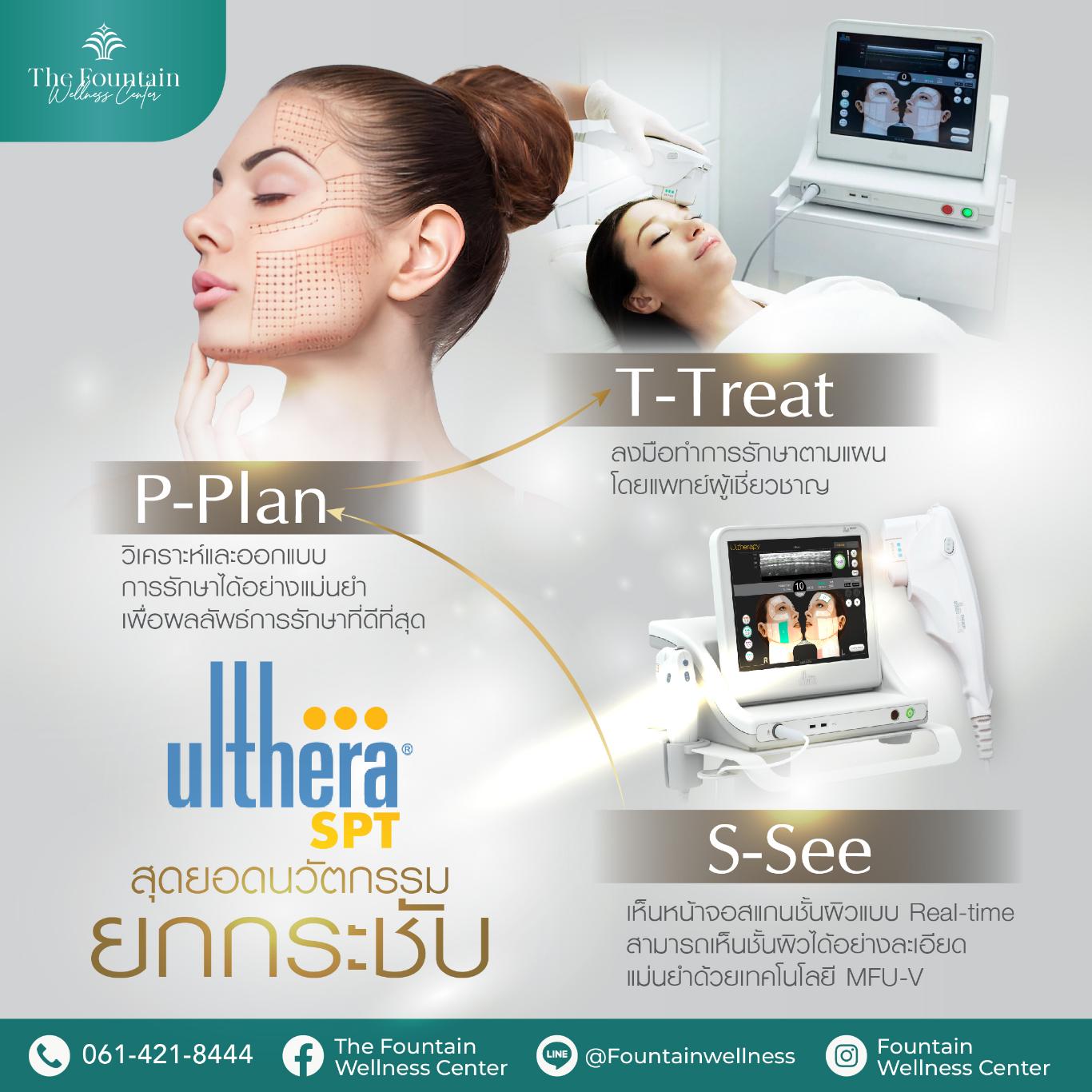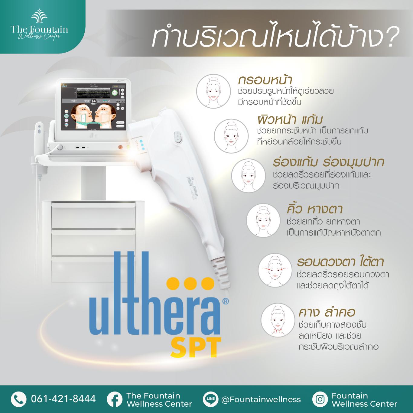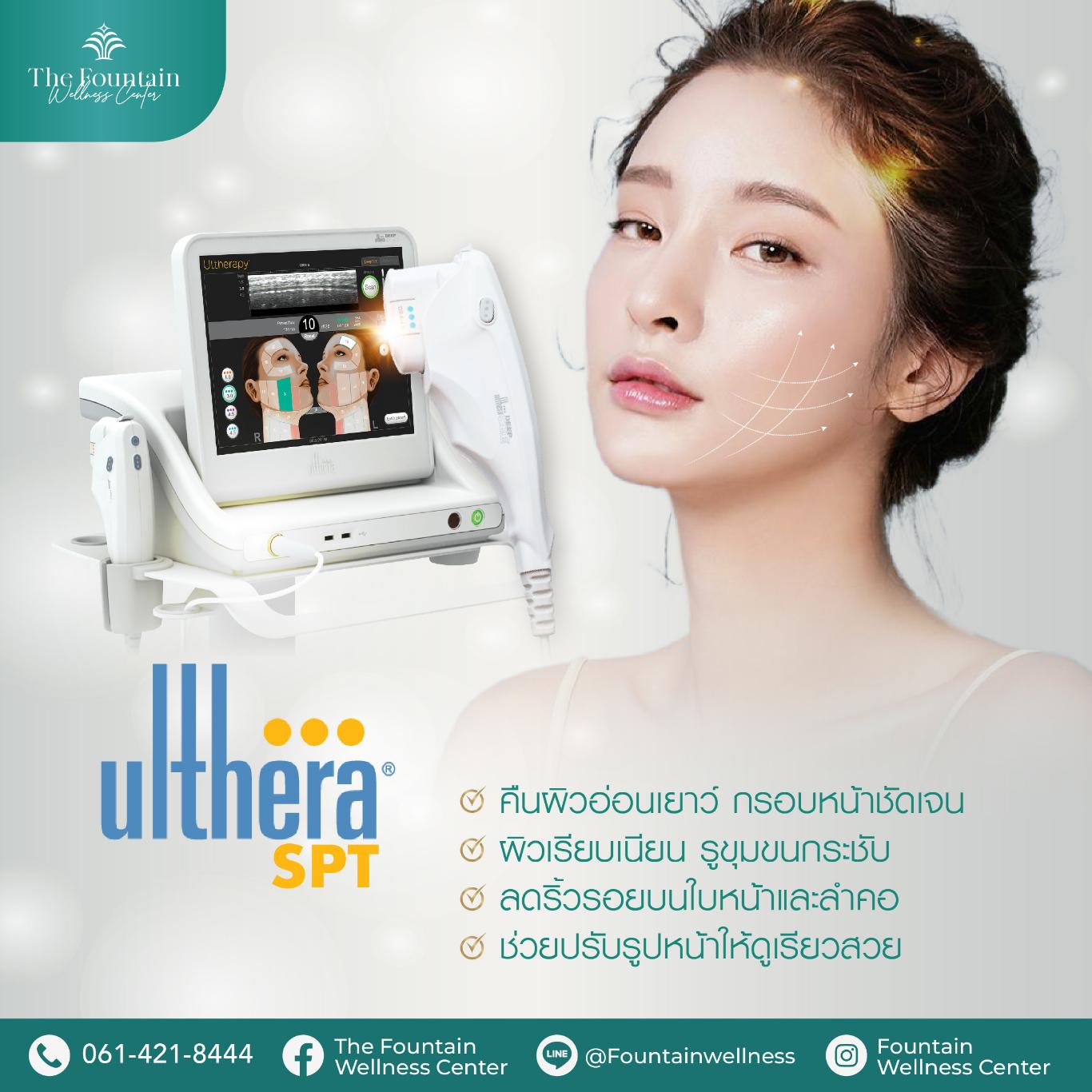 เทคโนโลยีUlthera SPT เป็นนวัตกรรมยกกระชับผิวและริ้วรอย โดยใช้อุปกรณ์ทางการแพทย์ที่เป็นเครื่องยกกระชับหน้าเข้าช่วยด้วยคลื่นเสียงอัลตราซาวด์ความถี่สูง (High Intensity Focused Ultrasound) จะสามารถกำหนดและปรับรูปแบบการรักษาได้อย่างเหมาะสม ตามลักษณะของผิวและปัญหาหย่อนคล้อยของแต่ละบุคคล โดยจะยิงลงไปใต้ชั้นผิว ทำให้ผิวหดตัวและยกกระชับขึ้น กระตุ้นการสร้างคอลลาเจน อีลาสติน สามารถแก้ปัญหาผิวได้แม่นยำ ตรงจุด โดยไม่ต้องผ่าตัด ไม่ต้องพักฟื้น ช่วยชะลออายุผิว และลดโอกาสเกิดริ้วรอยในอนาคต